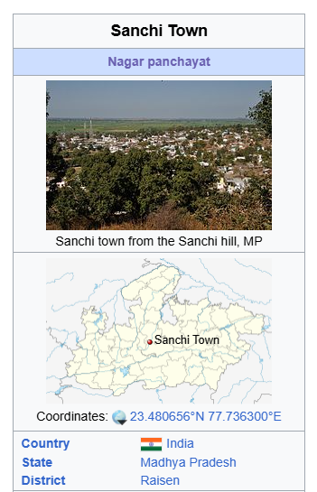 Sanchi Sanchi town is situated on a hill in Raisen district of Madhya Pradesh state of India. It is situated in the central part of Madhya Pradesh, 46 km northeast of Bhopal, on the banks of Betwa river, and 10 km from Besnagar and Vidisha. There are many Buddhist monuments here, which date from the third century BC to the twelfth century. Sanchi is a Nagar Panchayat of Raisen district. The great main stupa of Sanchi was originally built by Emperor Ashoka the Great in the third century BC. Later, Emperor Agnimitra Shunga renovated this stupa of Sanchi and made it bigger and grander. In its center was a hemispherical brick structure, in which some relics of Lord Buddha were kept. At its peak was an umbrella, a symbol of high respect given to the monument.